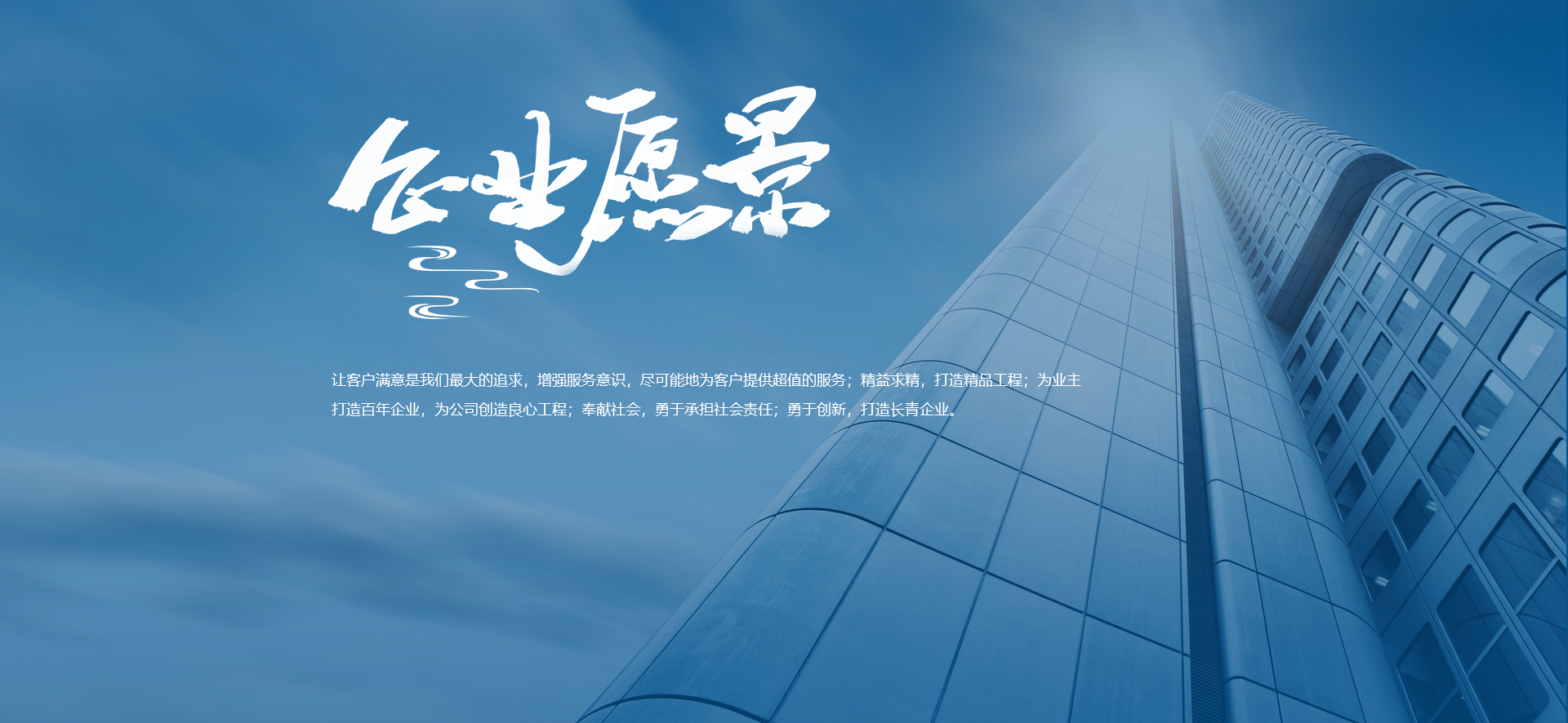 企业愿景:让客户满意是我们最大的追求,增强服务意识,尽可能地为客户提供超值的服务;精益求精,打造精品工程;为业主打造百年企业,为公司创造良心工程;奉献社会,勇于承担社会责任;勇于创新,打造长青企业。
